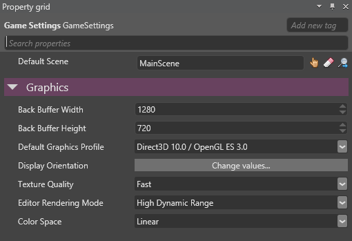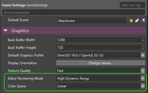A new mandatory “GameSettings” asset allows you to define the main properties of your game: Default Startup Scene Resolution Graphics Profile (DX9, 10 or 11) HDR or LDR mode Color Space: Gamma or Linear (more details below)