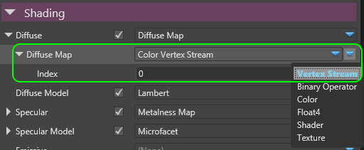 - Vertex stream in materials can be used as color providers.
