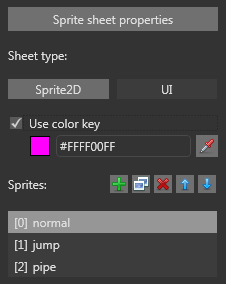 The sprite editor has been improved in several ways. First, the left pane now let you select the sheet type (sprites or UI) and the color key. To easily set the color key from the image itself, a color picking tool has been added. It is also possible to duplicate an existing sprite so you don’t have to enter the same parameters again and again.